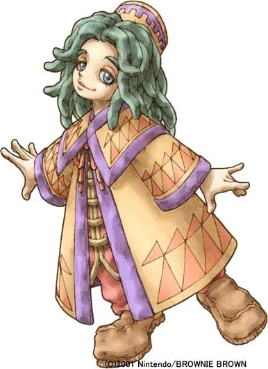 Arancia's hair is green and tied in dreadlocks, topped with an orange and purple fez. Her eyes are also green, possessing a laid-back quality in their shape. For clothes, she wears an orange cone-shaped robe lined in purple fabric, and patterned with tangerine triangles. Over her shoulders is a large collar that covers the robes' drawstring, and underneath is a baggy red suit with golden buckles. Her choice of footwear is leather shoes.
