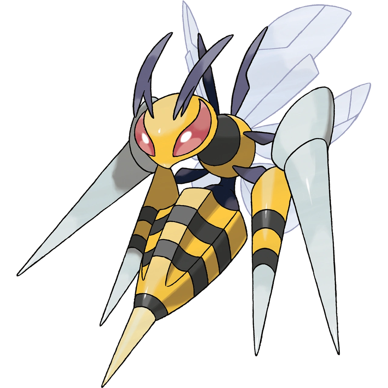 It has three poisonous stingers on its forelegs and its tail. They are used to jab its enemy repeatedly. Mega Beedrill - Its legs have become poison stingers. It stabs its prey repeatedly with the stingers on its limbs, dealing the final blow with the stinger on its rear. |
