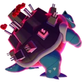 | Pokémon Sword | It crushes its foe under its heavy body to cause fainting. In a pinch, it will withdraw inside its shell. Gigantamax - It's not very good at precision shooting. When attacking, it just fires its 31 cannons over and over and over. |