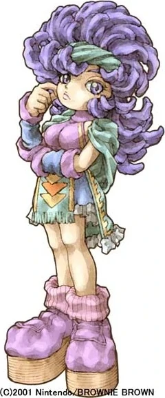 A lot of Blueberry's clothes reflect her affinity with the Water element, both in color and flowy style. She has curly violet hair that is held up with a green headband, and has irises of a violet hue. For a torso, she wears a teal cape and purple shirt, and has a frilly skirt patterned with yellow triangles along her waist. Her platform shoes are colored purple with brown bases, and she also wears a pair of pink slouch socks.