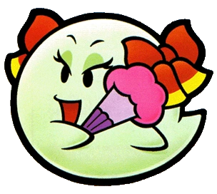 Bow (JP) is the princess of the Boos in Boo's Mansion. She will befriend Mario and join his party in the game Paper Mario. She can shield Mario by making him disappear in both battles and non-battles.