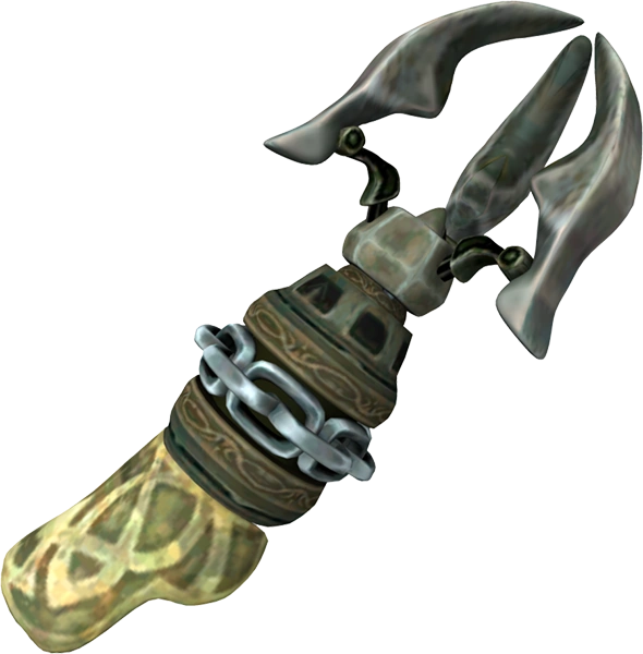 The clawshot is an item found in The Legend of Zelda: Twilight Princess. Later on in the game the player can come in possession of an expansion called the Double Clawshot. It is a spring loaded grappling hook, very similar to the Hookshot, an item present in the previous titles. It features three hooks that grasp onto specific items. After the protagonist Link grapples onto something, then he can either send himself towards it or bring an item towards him. The weapon has also been influenced by the Grappling Hook of The Legend of Zelda: The Wind Waker.