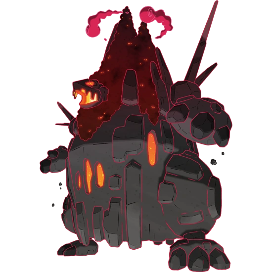 To intimidate its opponents, Coalossal will vigorously shake its body, scattering coal from its smoldering back.