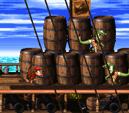 - In the first level of the first world, the first screen you get is almost exactly the same as Donkey Kong Country's King K. Rool boss battle.