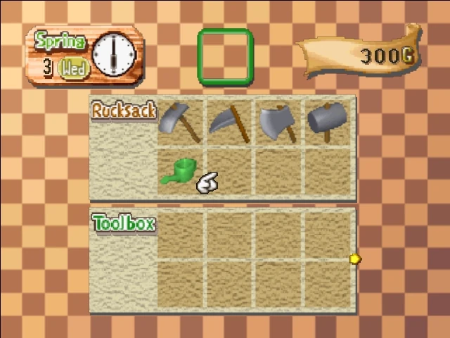 The player begins with a house, a barn to keep cows and sheep, a chicken coop, a large field littered with rocks, weeds, and tree stumps that can be cleared for planting, a dog, and five tools: a hammer, sickle, hoe, axe, and watering can. The game uses the currency of "g", often referred to unofficially as "gold", and the player starts out with 300g. Currency is used to purchase items at the shops and can be obtained by selling products from the farm, foraging plants from the mountains, fishing, and mining.