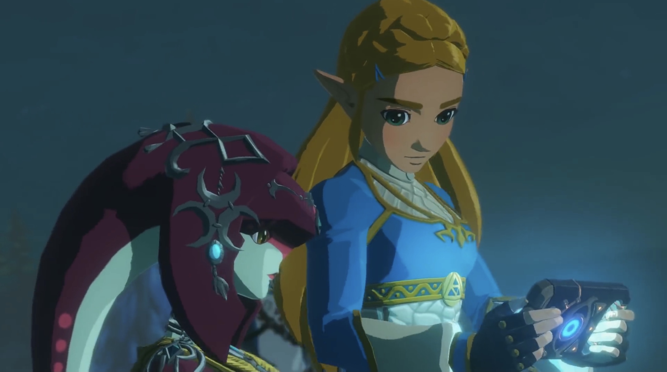 Zelda and Mipha look into the Sheikah Slate.