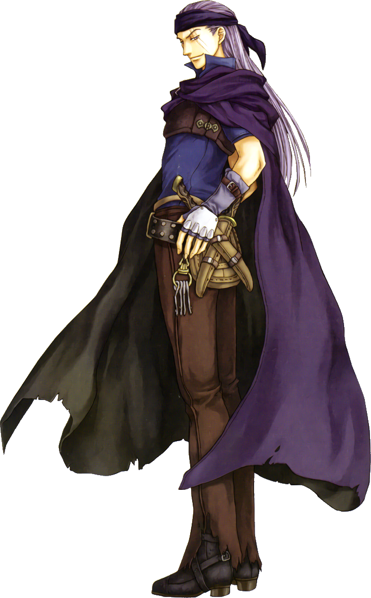 At this point, he appears near the Dragon's Gate on Valor, The Dread Isle with the purpose of plundering the treasure and then escaping. However, he is intercepted by one of the Lords of Lycia, who convince him to join their side and help them with his knowledge of the Black Fang. Subsequently, when the army travels to Bern, he makes another appearance in Chapter 23, where he offers advice to the three lords as they discuss their proceedings, to which Eliwood thanks him. He is seen even if the player did not recruit him in the chapter that he initially appears in.