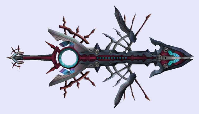 Malos' Monado is the weapon used by Malos, this Monado comes from the fact that Malos himself is in fact the personification of Logos, one of the three cores of the Trinity Processor. During most of the story Malos is unable to use his weapon due to the damage inflicted to his core during the Aegis War. After retrieving the missing data of his core from Pyra, one of the personifications of the third core, he is able to summon his weapon once again.