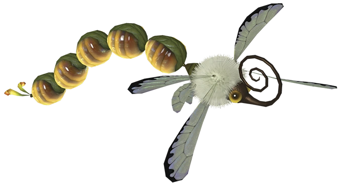 The Nectarous Dandelfly is completely harmless and spend most of its time storing Nectar inside their segmented bodies, similar to the Honeywisp. They are a great source of nectar given that each of its segment will give a drop of nectar if destroyed. The captains can throw Pikmin on one of its segment to make it drop on the ground alongside any that are found behind it. They typically travel on a single path flying around the area.