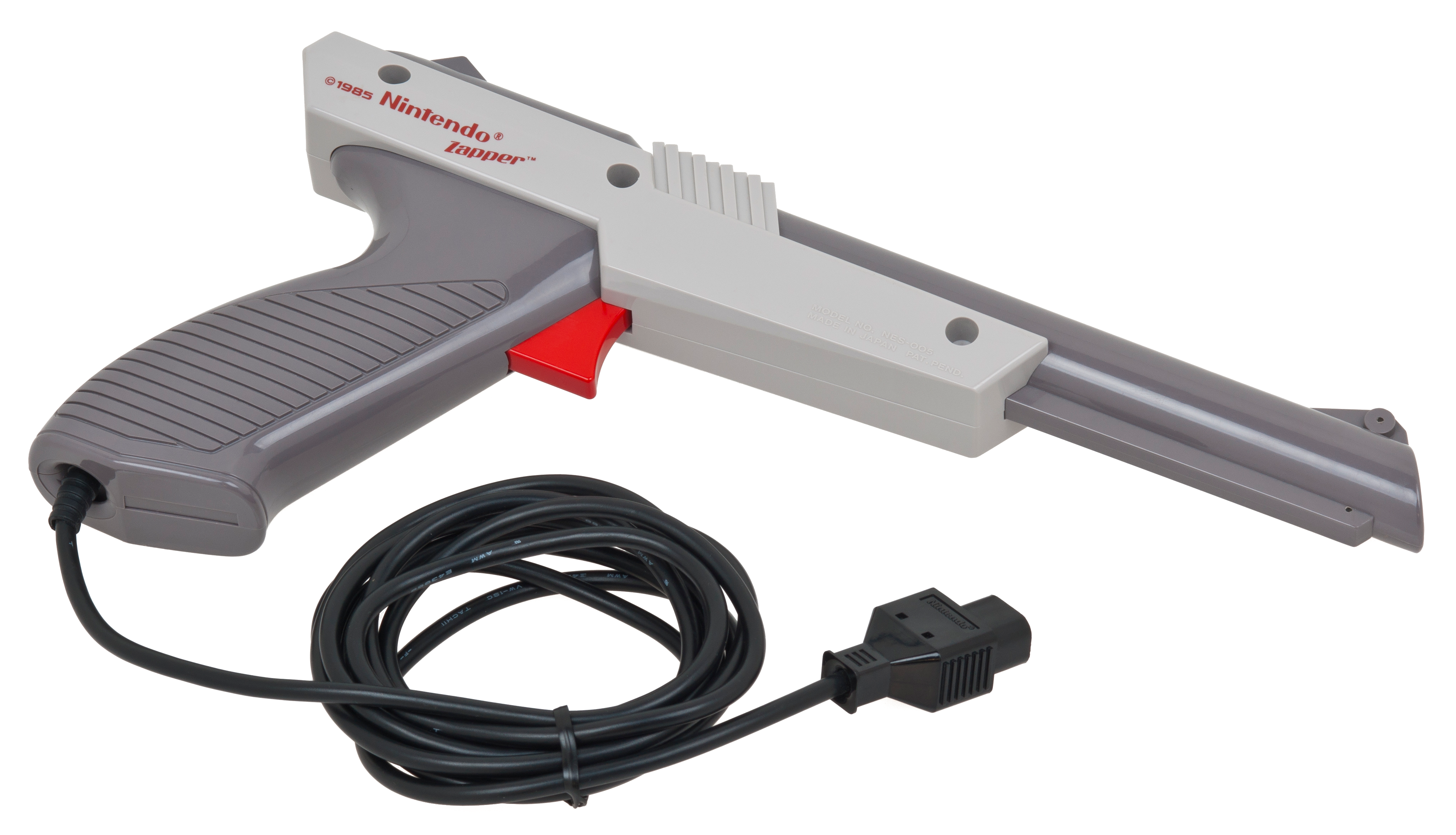With the NES Zapper you would point at the screen and shoot the targets. It worked a little differently from its arcade counterparts, presumably due to keeping costs low. Like R.O.B., there is a sensor on the NES Zapper. Whenever you press the trigger on the gun, it causes the screen to go black, though every possible target will be white. The sensor on the gun senses light and dark, and will know whether or not you hit a target if it spots a white sprite. There were quite a few games that were made specifically for the Zapper, including many Nintendo published titles and third party games.