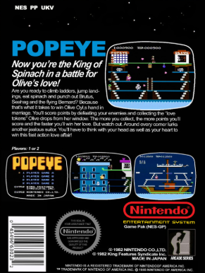 Popeye(JP) is a 1982 video game developed by Nintendo R&D1 and originally released in arcades. The game is a platformer in a similar vein to Donkey Kong, which was also developed by R&D1. Interestingly, Shigeru Miyamoto originally wanted Donkey Kong to feature the characters from the third-party franchise, Popeye, though Nintendo couldn't receive the license to do so. However, after the success of the game, it was understandable that they would be given the right to create a game based off of the property. A Famicom port of the game was released alongside the console, and years later the game would be released for the Nintendo Entertainment System in America.