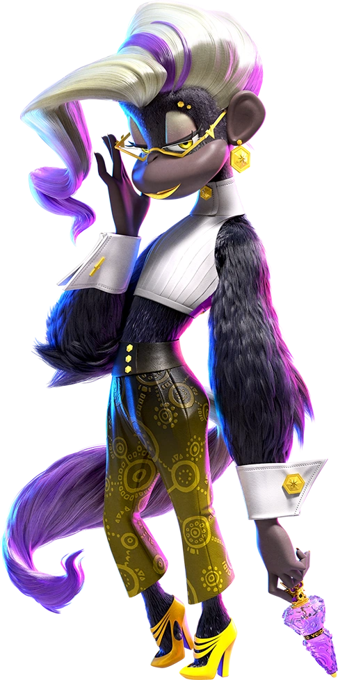 Poppy Kong wears a fashion-like attire with a white and purple curly hairstyle. She wears a lipstick, glasses, jewelry, and high-heel shoes - all in yellow and gold color. She also wears a sleeveless coat, hand collars, and leather pants. She has a perfume that makes her invisible and can run at great speed.