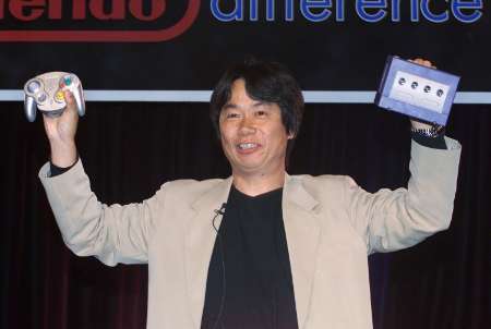 Miyamoto holding a GameCube and a Wavebird.