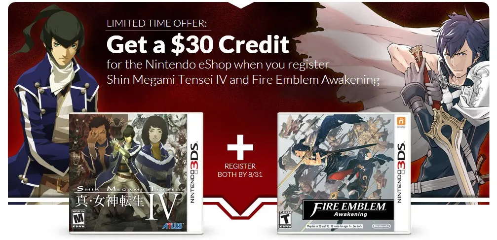 To promote the announcement of Shin Megami Tensei X Fire Emblem and the release of Shin Megami Tensei IV, Club Nintendo offered $30 USD in Nintendo eShop credit to members who registered both Shin Megami Tensei IV and Fire Emblem Awakening for the Nintendo 3DS from July 16, 2013 until August 31, 2013.[2][3] After each game is registered to the same Club Nintendo account, members needed to complete a registration survey by the August 31 deadline to receive the credit.[1]