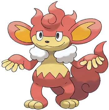 Simisear is a simian Pokémon that is primarily red. Its ears are broad with orange insides, and it has oval eyes and a small black nose. It has a swirled, flame-like tuft on its head with a smaller tuft on either side of it. Simisear has white shoulder ruffs; and a cream-colored face, chest, fingers, and toes. Its hands have five fingers, and its feet have three toes. Its fluffy, swirled tail resembles a flame. There is a flame flickering inside its body, which it fuels with sweet foods. It is also capable of scattering embers from its tail and the tufts on its head.