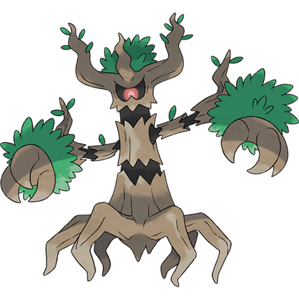 This Pokémon controls trees via roots stretching from its feet, and it will attack anyone that dares to ravage the forest.