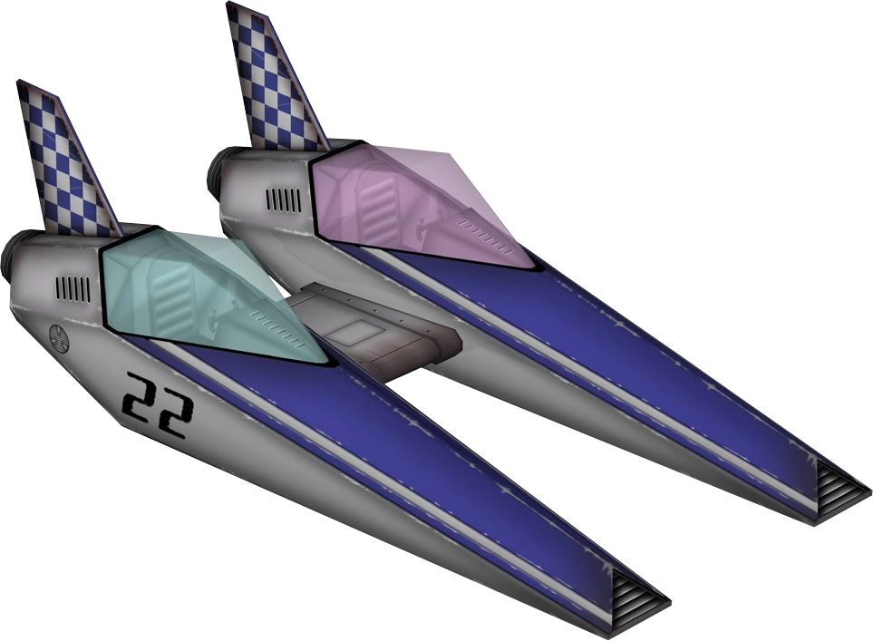 The Twin Noritta is unusual not only for having two cockpits, but also being incredibly light in spite of this. The reason is due to the machine being made of a special metal unique to Gomar & Shioh's home world of Huckmine. This makes the vessel light, but also not as durable as other machines. As a result, their machine is best when it can stay ahead of other racers and avoid being pushed into walls. This is made easy due to the machines great boost and decent handling, although it does have a low top speed.