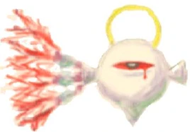 O₂'s appearance is an imperfect, white sphere. He possesses a single red eye, two wings covered in blood, a bandage on his head, a yellow halo, which changes color when hit, and has a spike at the bottom, where later a thorny vine pops out.